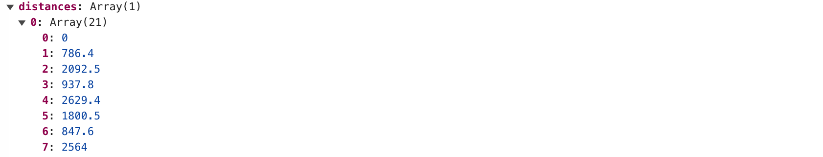 Therefore, location 0, which is 4532 West 4th Avenue, corresponds to the first coordinate (-123.2100192,49.2688067), and the subsequent locations follow in the same order. To find the distance from location 0 (4532 West 4th Avenue, Vancouver, BC) to location 1 (Togo Sushi UBC, 3380 Shrum Lane, Vancouver, BC), you would use distances[0][1]. In this case, it shows a distance of 3627.8 meters, which is very close to the 3448 meters returned by Google Maps.